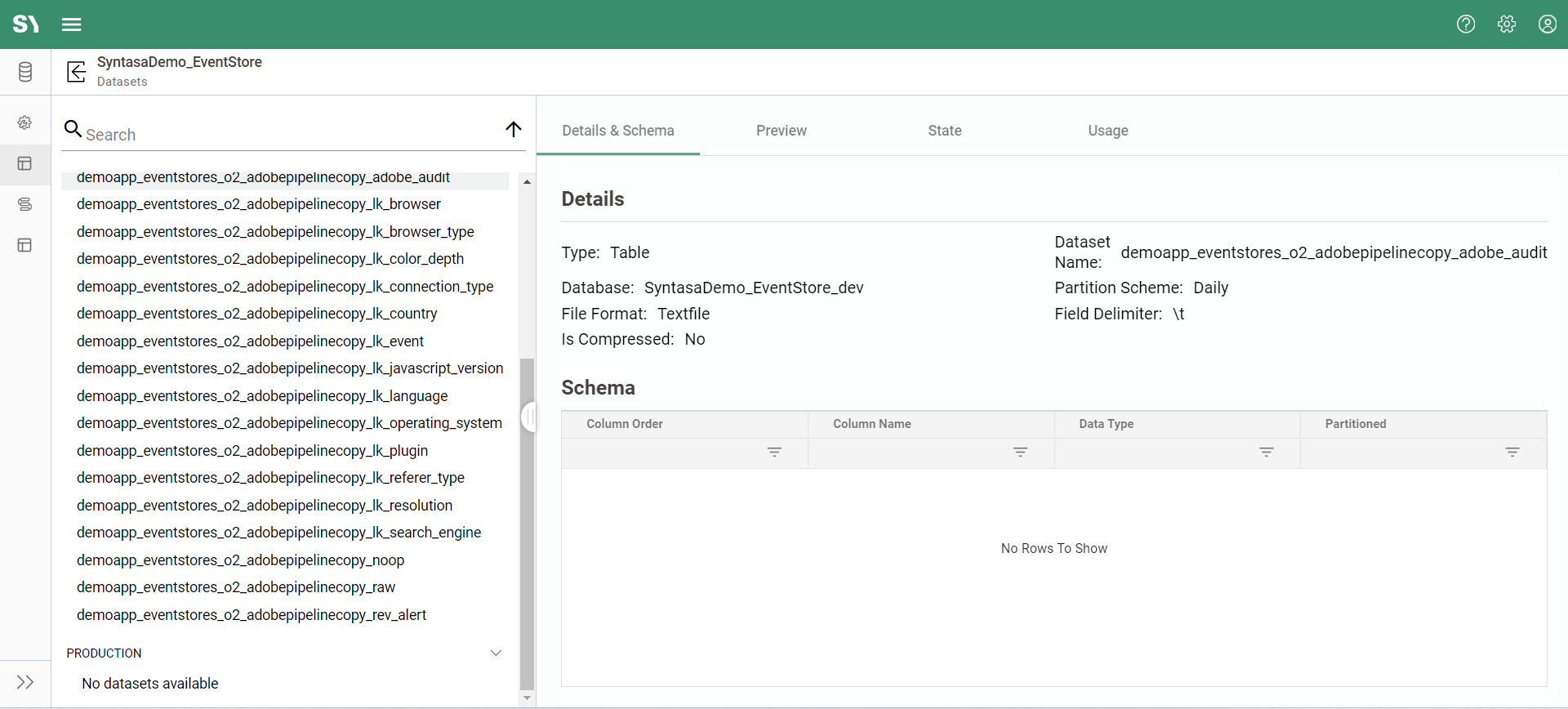 When an event store is used by any app, a database is created with its tables depending on the type of process we have used in the application. The database for development and production are created separately. If you want to have a look at these tables and their data, you can check it within the syntasa application by navigating to DataStores>>DataSets tab.