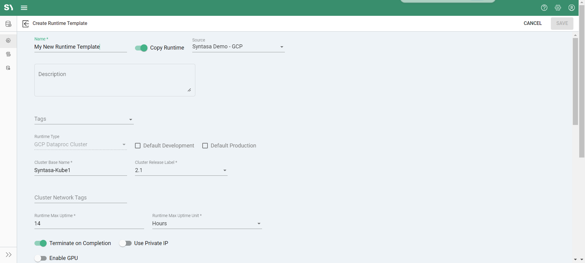 The screenshots below illustrate an example where the 'Syntasa Demo-GCP' runtime template is chosen from the 'Source' dropdown, and all its values are automatically copied into the respective fields.