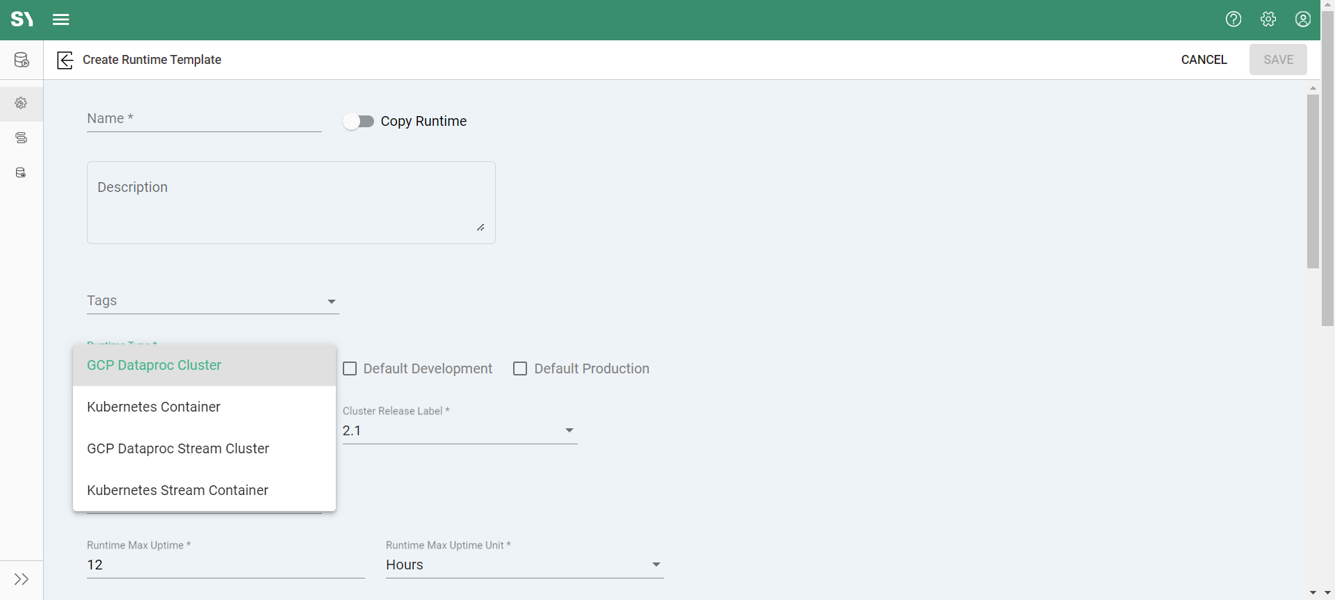 Creating a new runtime template entails several pieces of information, some only affecting the attributes of the runtime template seen within the Syntasa environment, and others relating to the cluster instance that is initiated within the cloud platform.