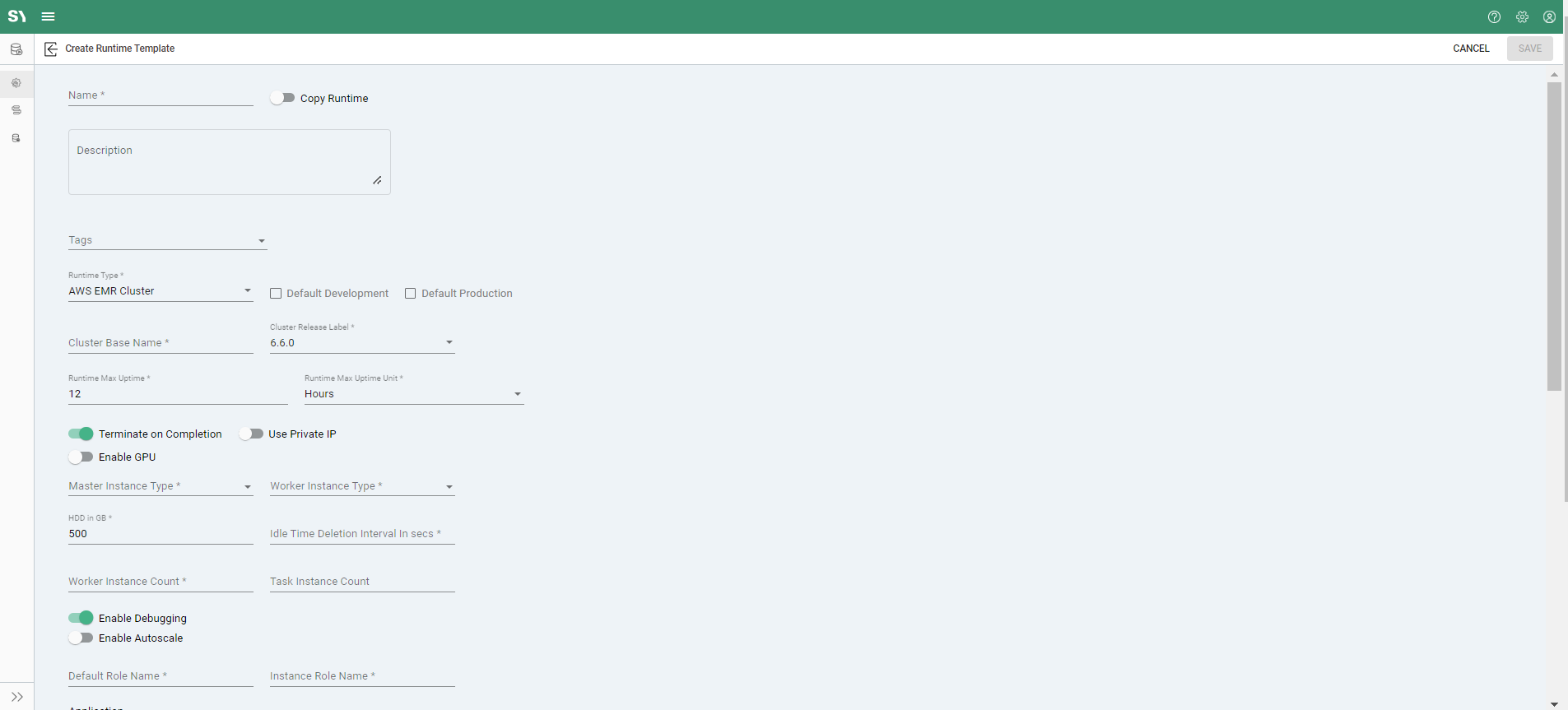 Application: There are several applications that can be utilized with the AWS EMR Cluster runtime. Checking the associated checkbox will enable the feature(s) on new cluster instances of the runtime template.