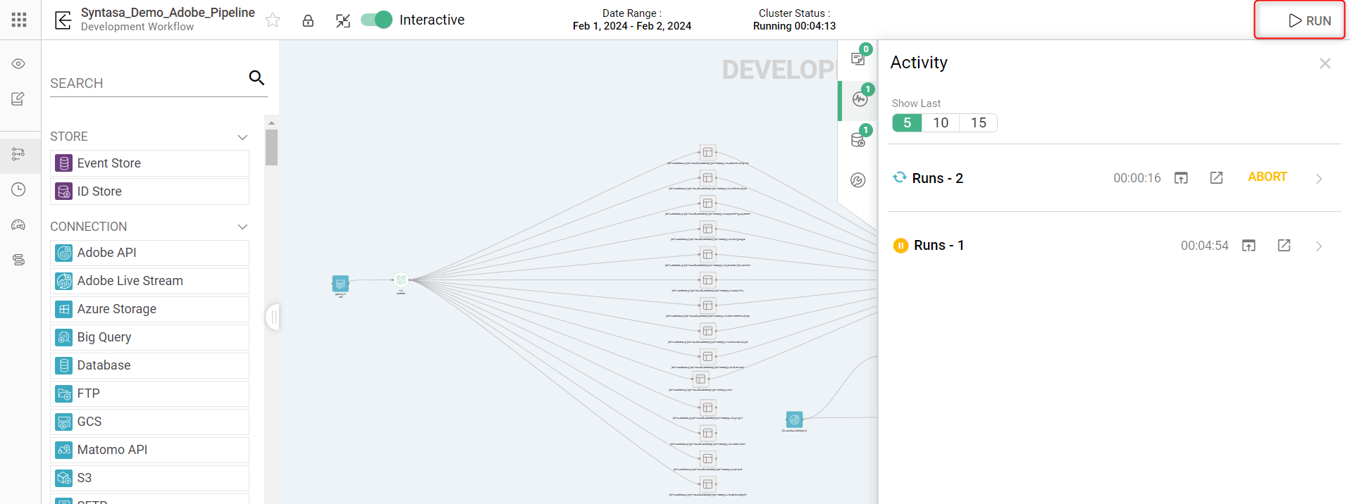 1. Run selected processes: If you wish to execute only specific processes, right-click on each desired process and select the 'Run' option displayed on the last process to execute all the selected processes simultaneously. After selecting 'Run' on the last process, a new run will be created under the 'Activity' tab, including all the chosen processes.