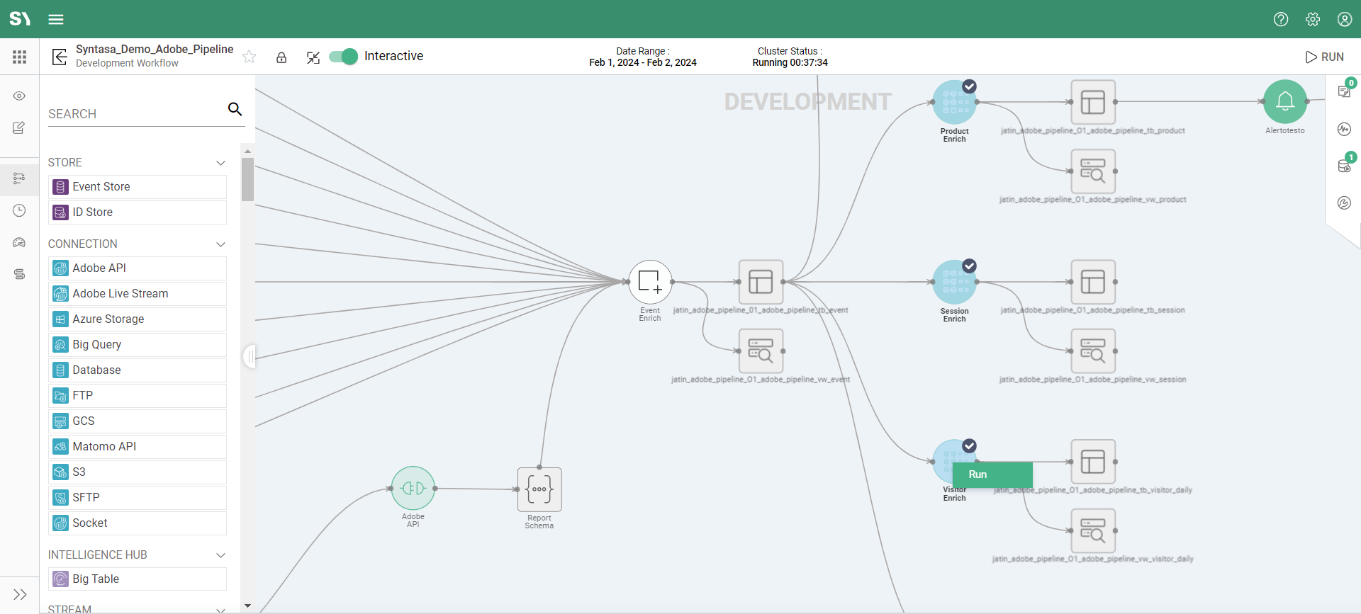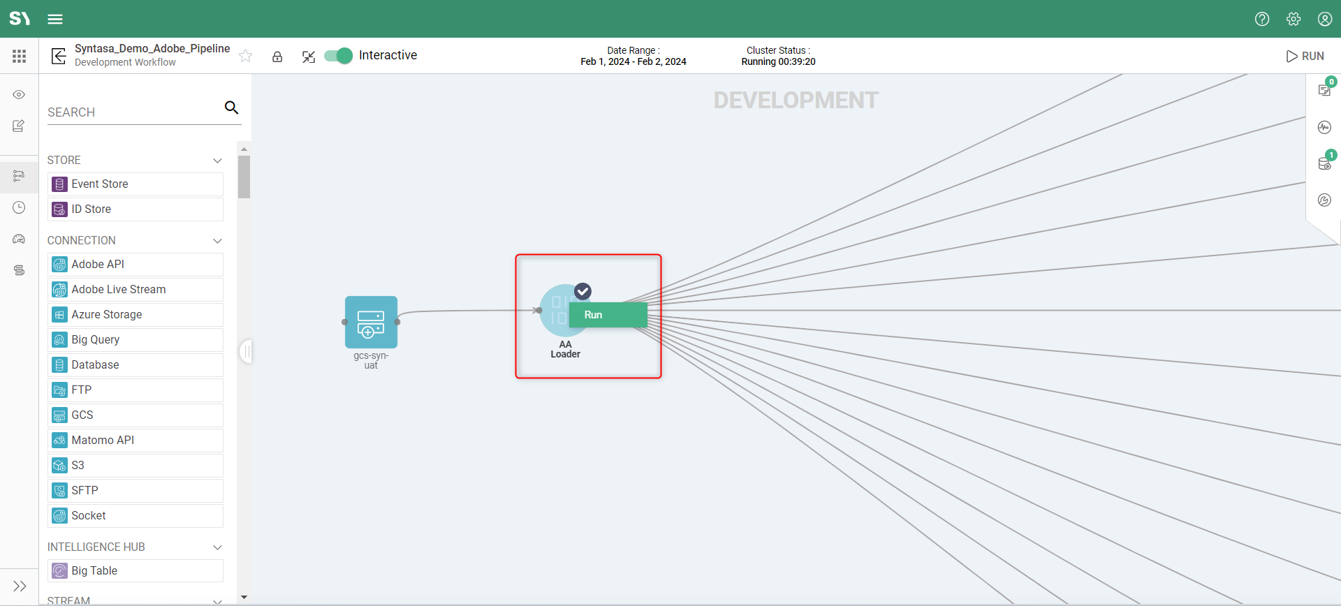The Interactive Mode toggle (mceclip3.pngInteractive) on the Horizontal bar of the App Canvas screen allows users to turn on/off Interactive Mode. This enables the ability to start and leave a cluster up while building or editing an app (only available in Development workflows).