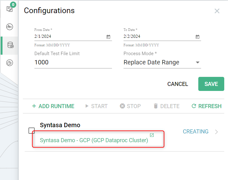 For example: If you are using GCP, you can see all the runtime templates you have added for the runtime types GCP DataProc Cluster and Kubernates Container. If you are on the AWS environment, you can see all the runtime templates you have added for the runtime types AWS EMR Cluster and Kubernetes Container.