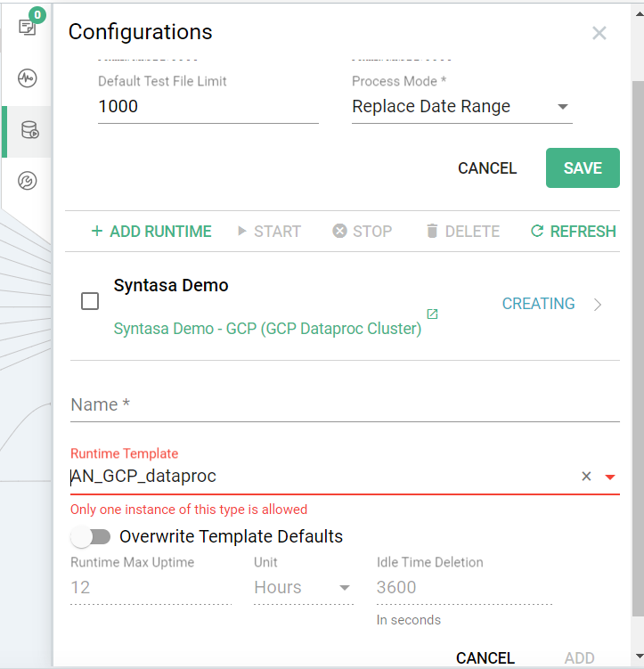 Note: Unlike Kubernetes Container, you can only add one runtime using a runtime template with the runtime type 'GCP DataProc Cluster'. Attempting to add a second similar runtime will result in an error, as depicted below.