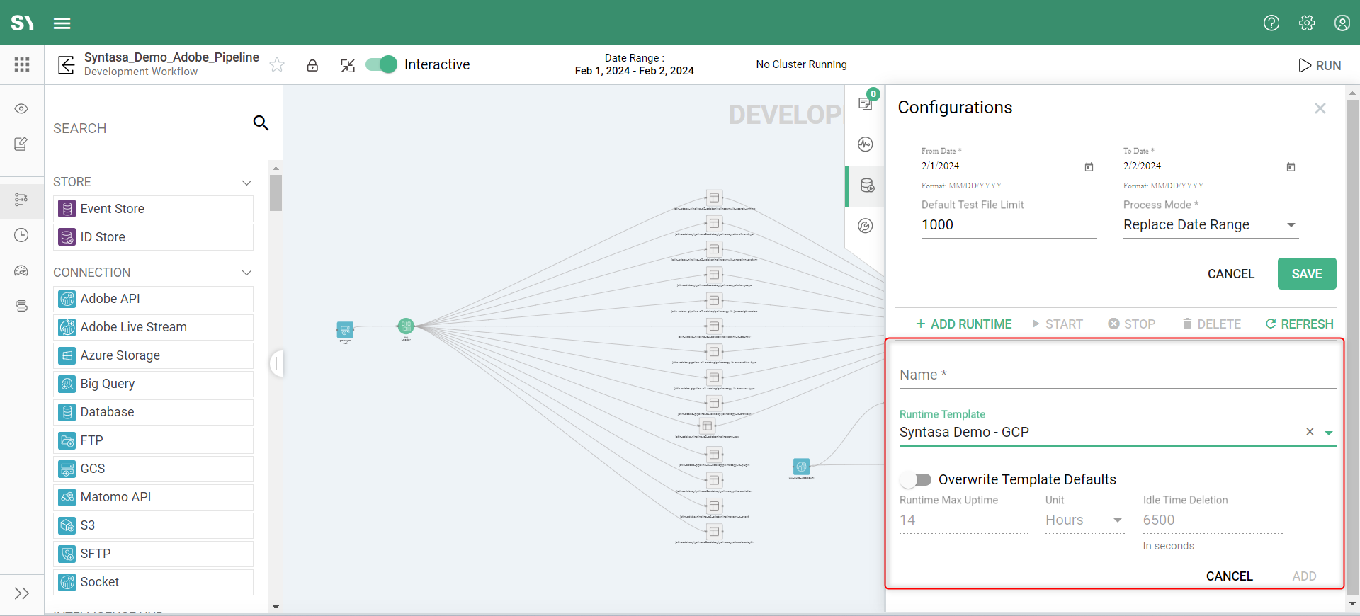 Note: Runtime types related to streaming processes like GCP DataProc Stream Cluster(GCP), Kubernetes Stream Container(GCP), and AWS EMR Stream Cluster (AWS) are not supported for Interactive mode currently.