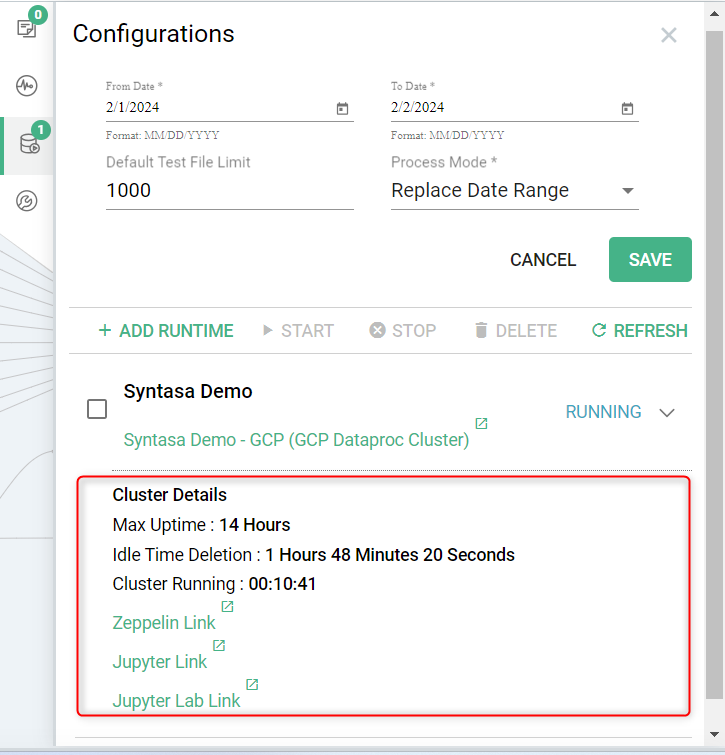 When the runtime is running, you can expand the runtime to check default settings and cluster running time. If you have enabled Zeppelin and Jupyter Notebook for the selected runtime template, you will find links to Zeppelin, Jupyter, and Jupyter Lab on expanding the runtime during 'Running' status.