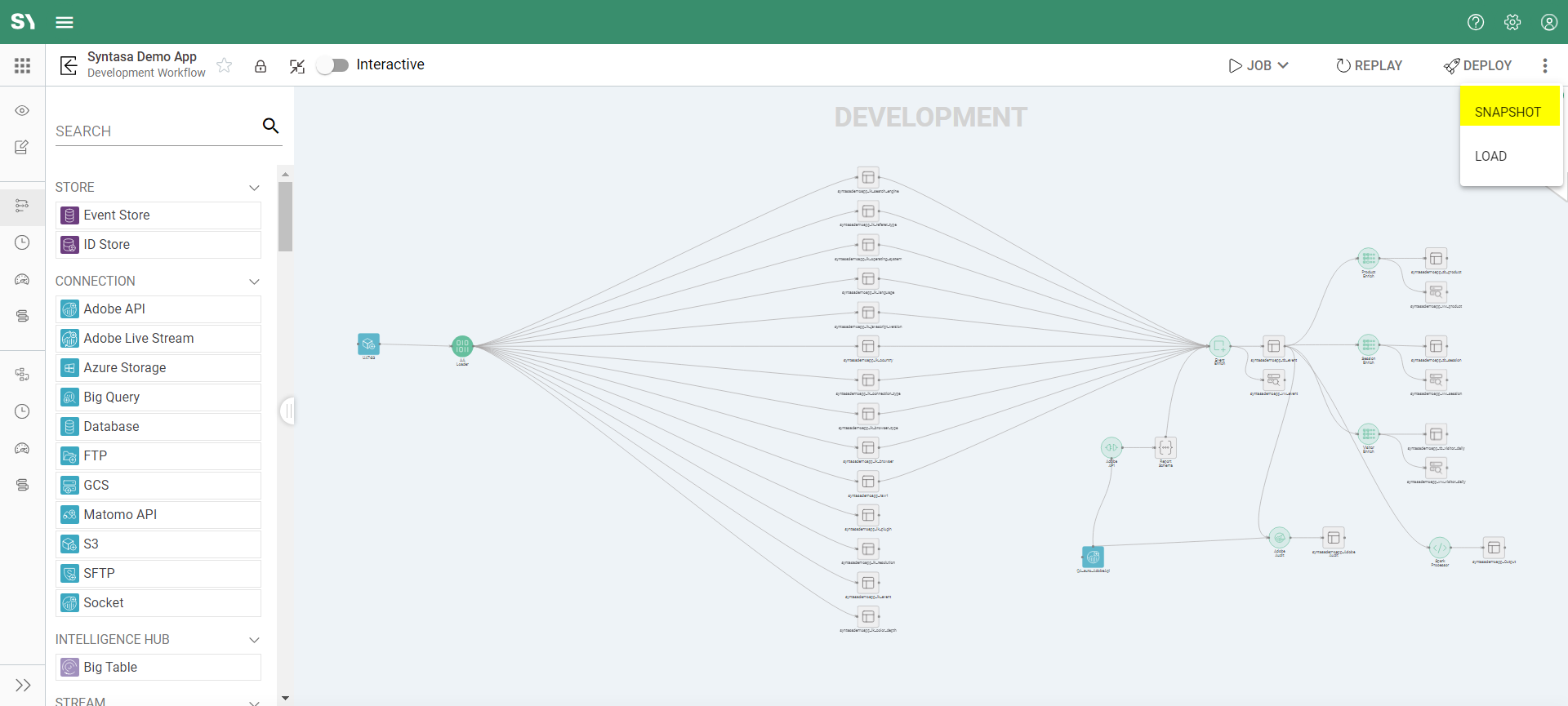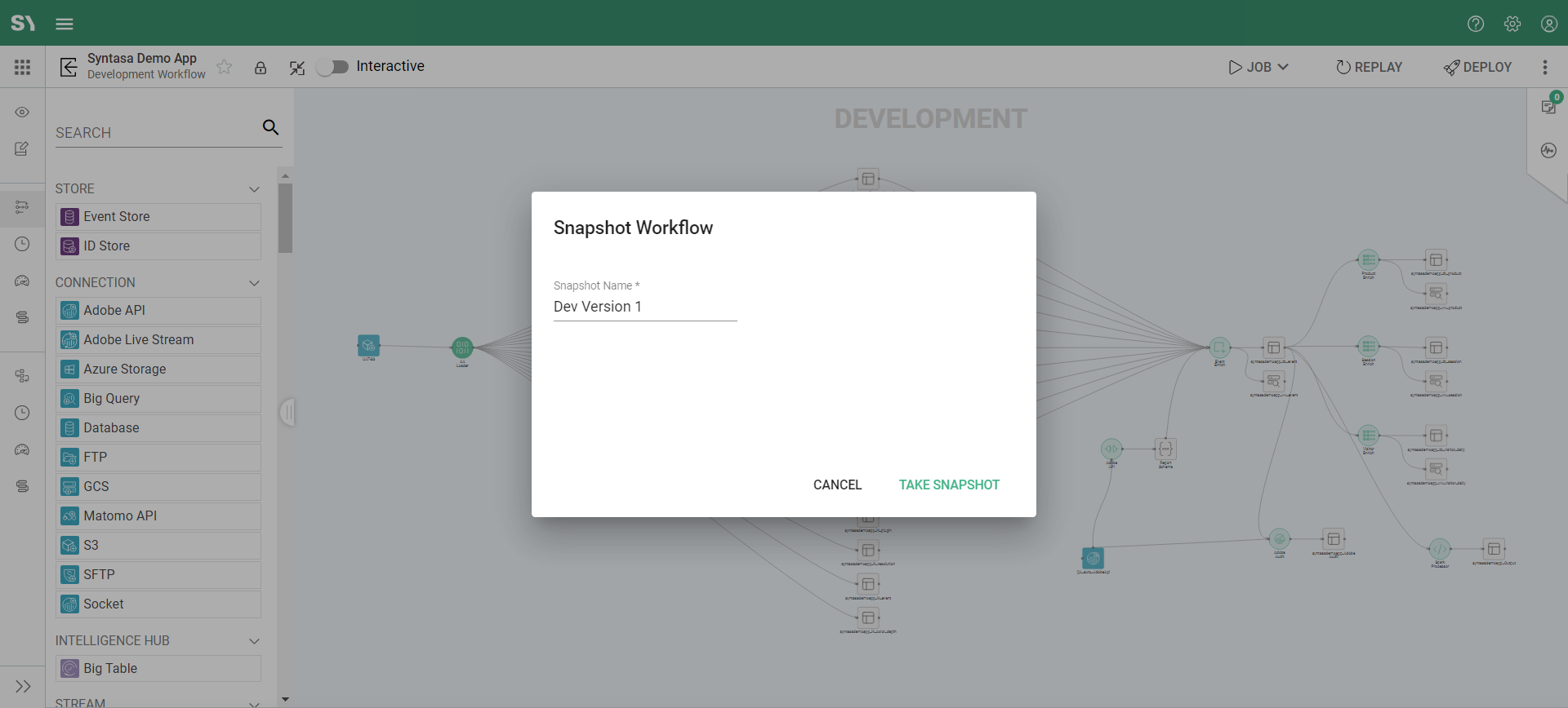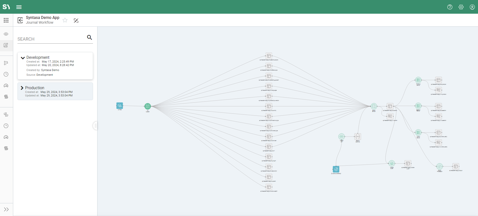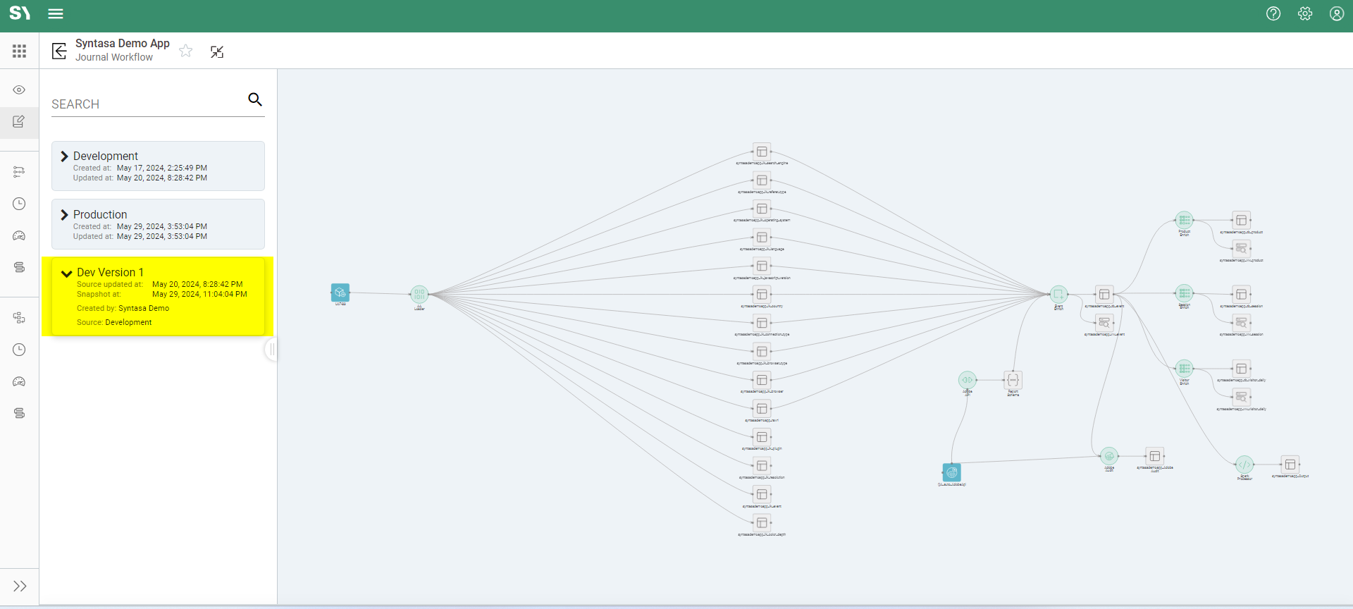 - When an app is created in Syntasa, a live snapshot of the development workflow is automatically created and named 'development,' which can be accessed from the 'Journal' screen. Upon deploying the development workflow to production for the first time, another snapshot named 'production' is created.