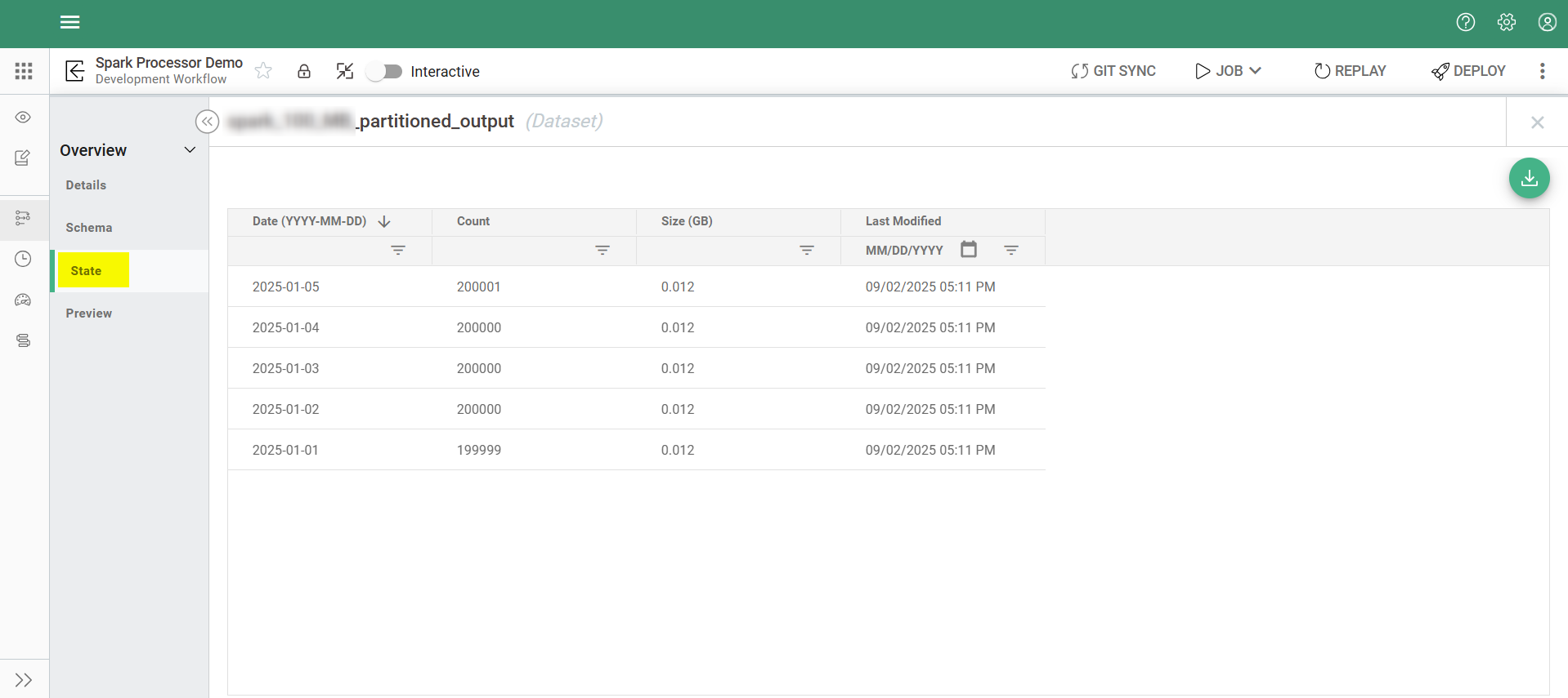 In the Syntasa application, you can verify whether a dataset is partitioned by navigating to the State screen of the Event Store or output node. If the dataset is partitioned, the State screen will display the data organized by date, as illustrated in the screenshot below.