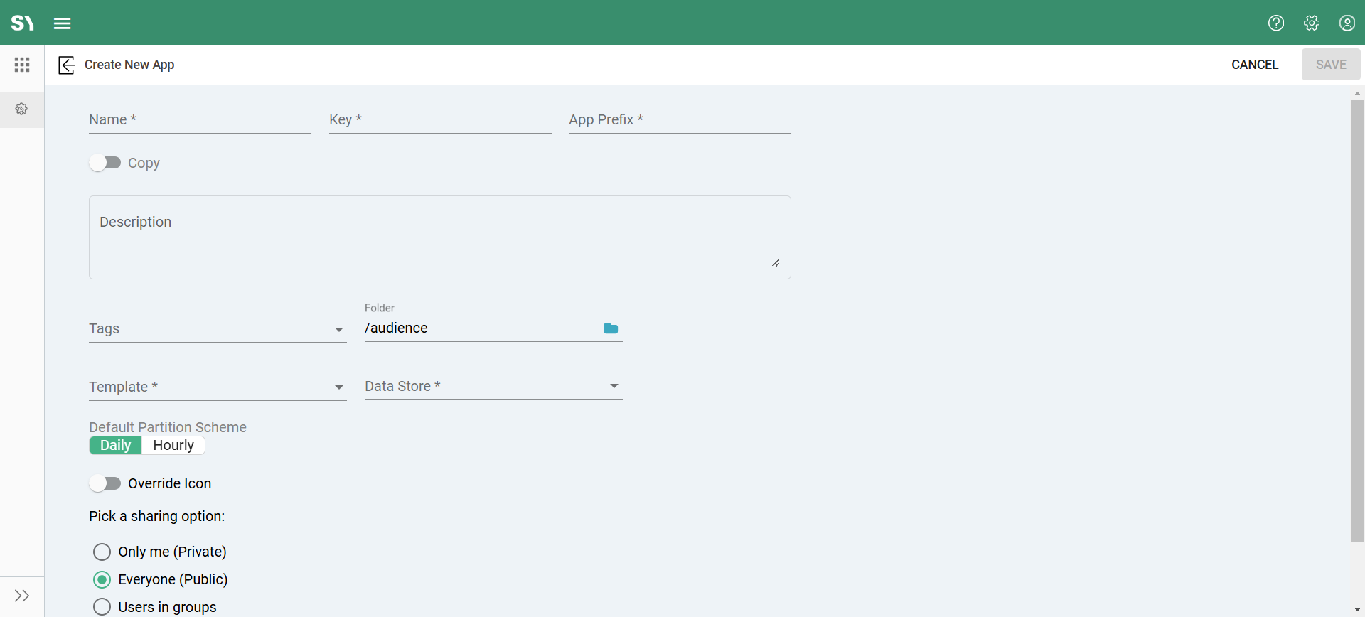 3. Click Create New and choose App. This will direct you to the Create New App page. Complete the form fields, and in the Template field, select Audience Sync.