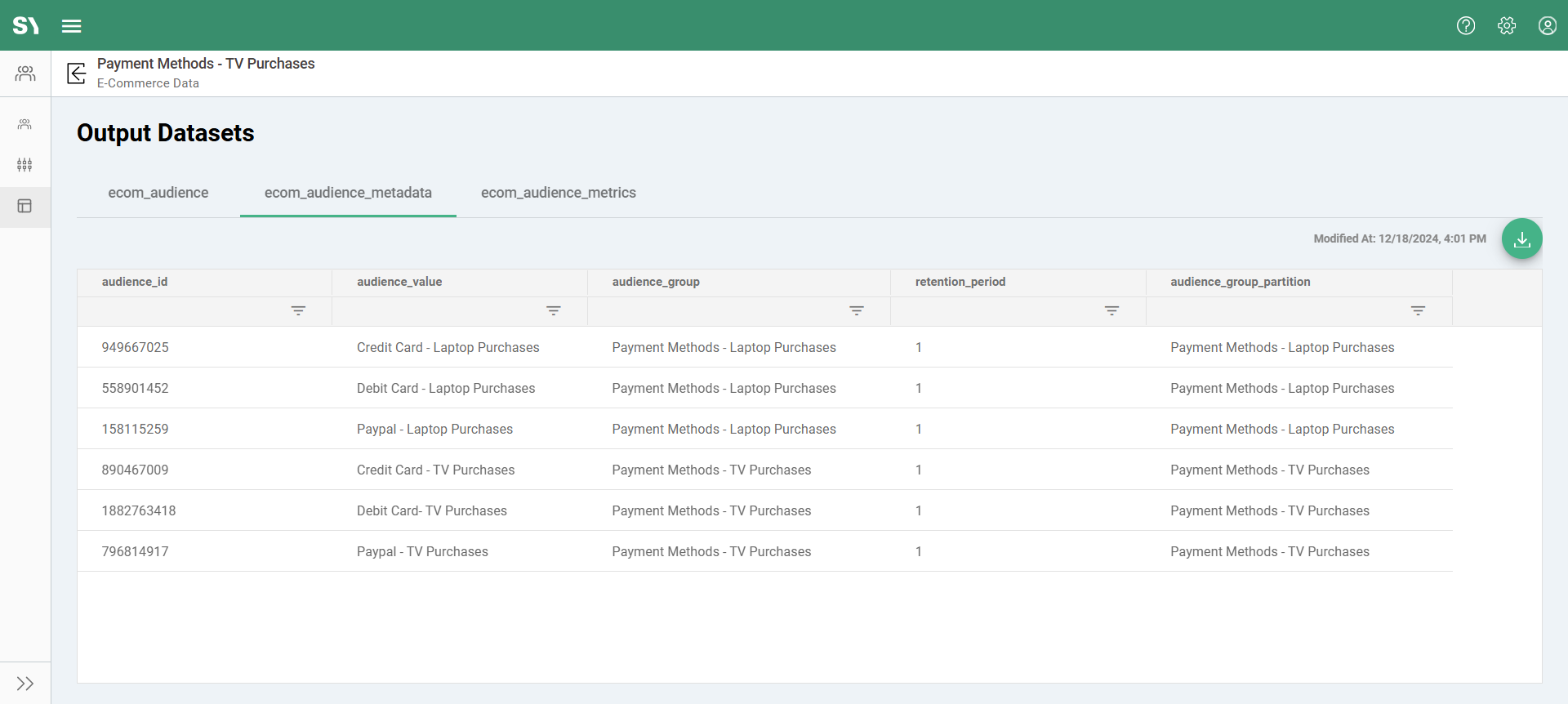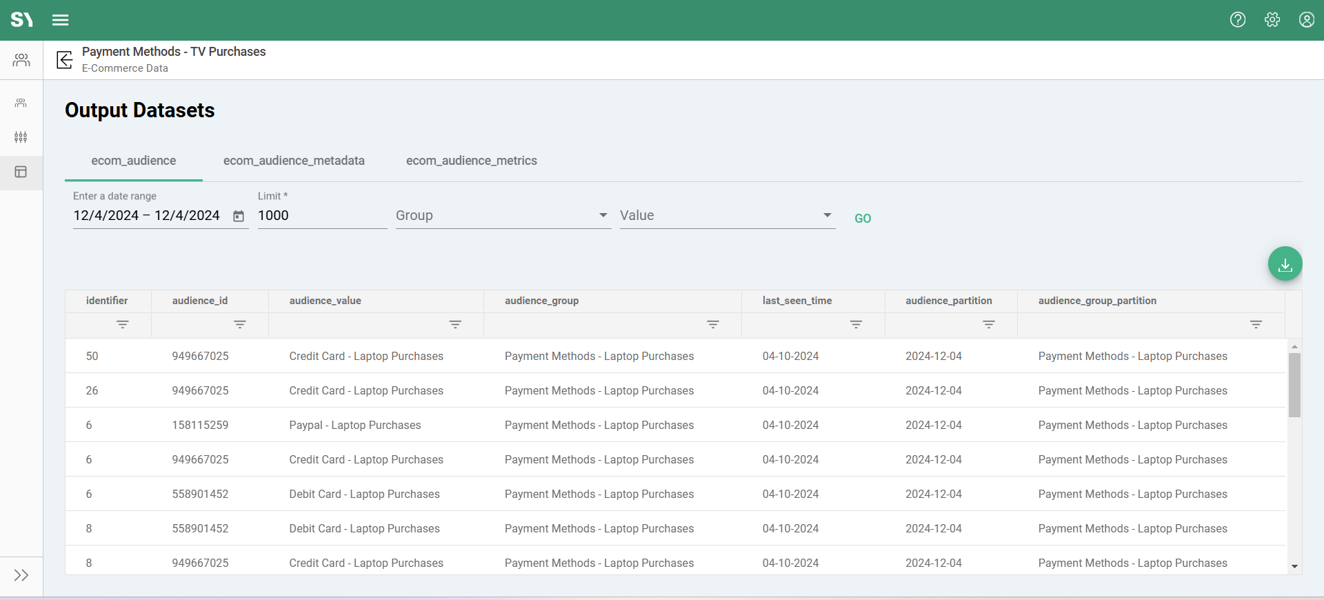 Note: The table preview displays results for all audience groups, even when accessing the Output Datasets screen for a specific audience group. This is because all audience groups within a data layer share the same output table. Additionally, the preview provides a limited number of records for reference purposes only. Please refer to the database to view all records in the table. This note applies to all 3 results tables.