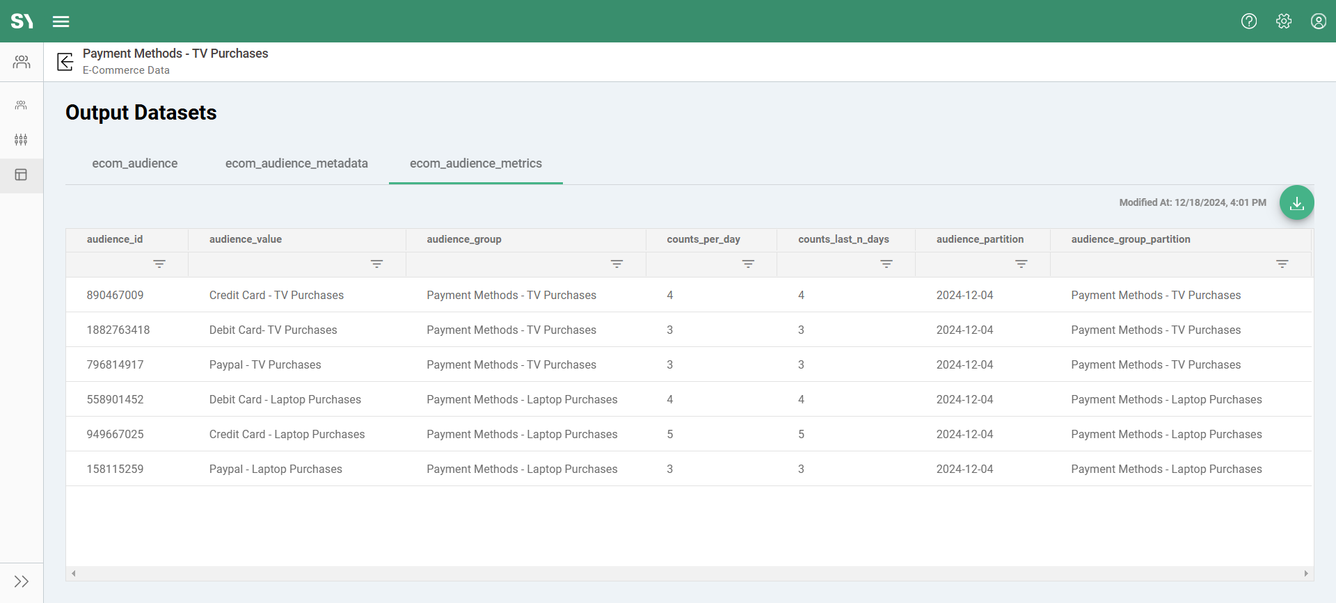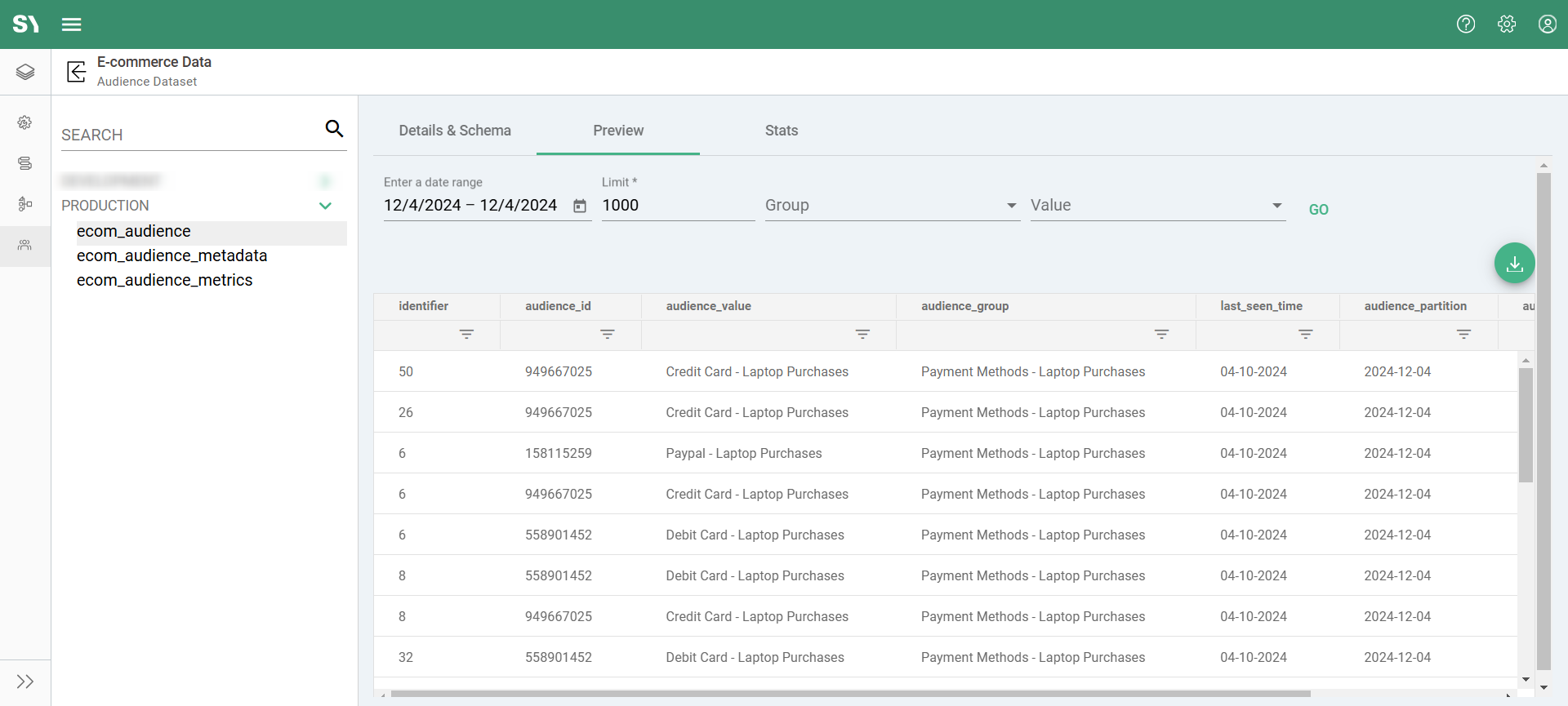 As the name suggests, this section provides a preview—displaying a limited number of results from the selected dataset. The data can be sorted and filtered within the application or downloaded as an XLSX file for external review. However, the download is limited to the data shown in the preview screen. The Preview section is also available on every Audience Builder page and Datasets screen under the Audience module.
