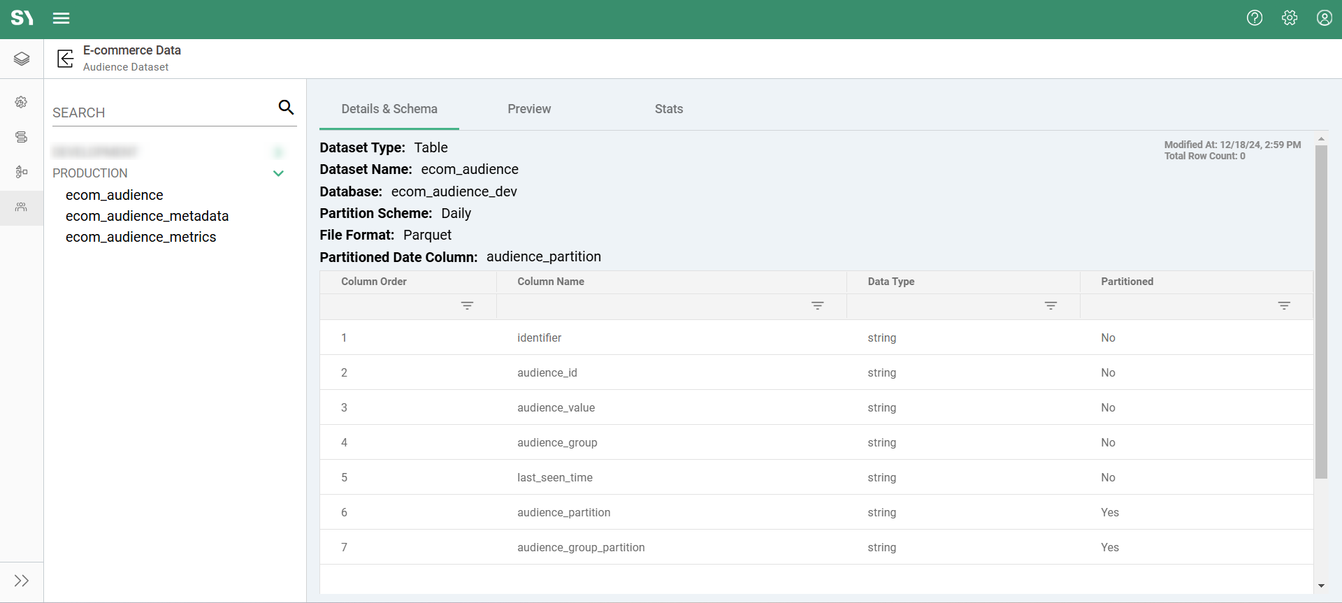 We can access more details about the output datasets like Details, Schema, Preview, and Stats under the Data Layer screen. Follow these steps to navigate to the Audience Dataset screen under Data Layer: