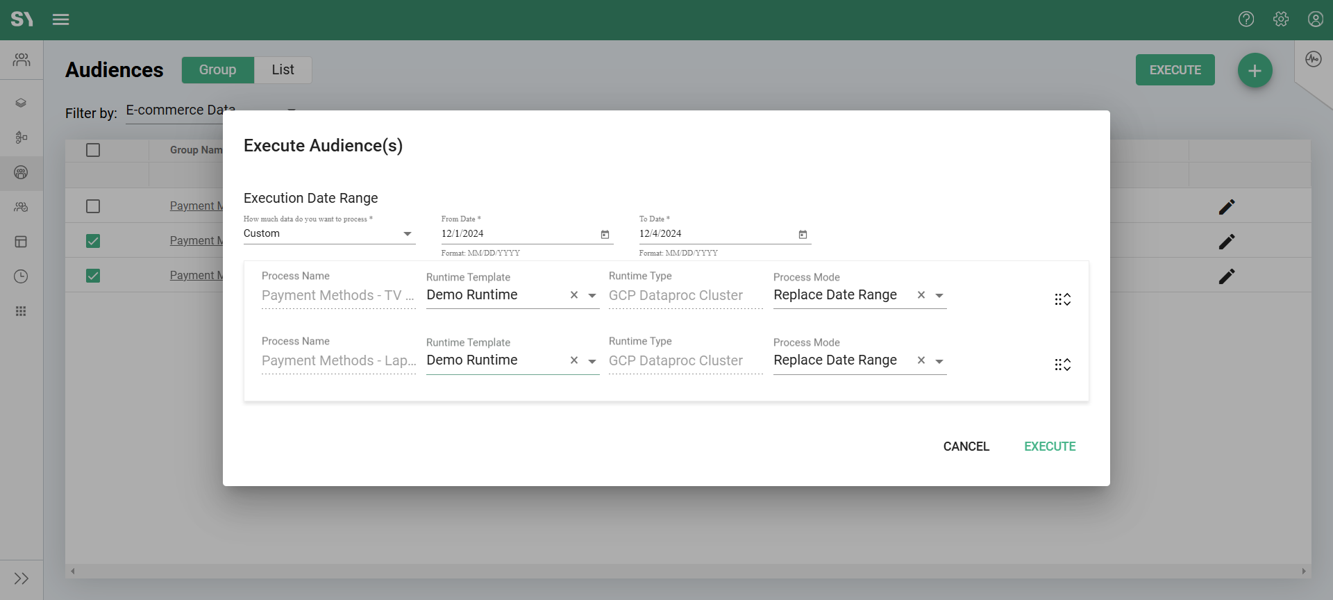 2. Click the 'Execute' button. This will open the Execute Audience(s) pop-up window, which displays the selected groups as steps.