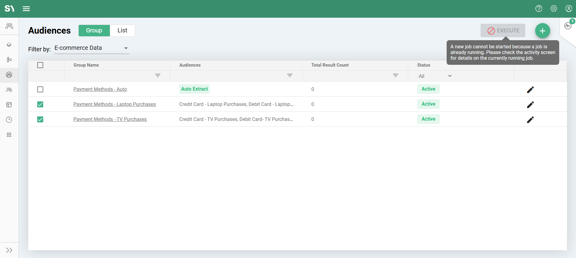If an ad-hoc job is already running and the user selects an additional audience group(s), the 'Execute' button will be disabled, as only one job can run at a time.
