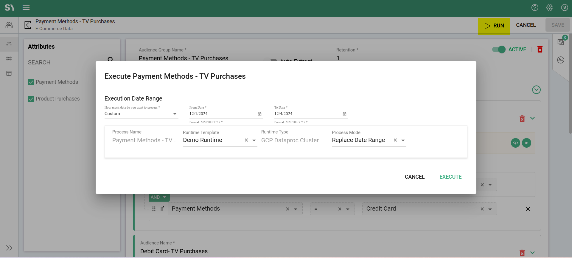 3. Click the Run button. This will open the Execute <audience_group_name> pop-up window with the selected groups displayed as steps.