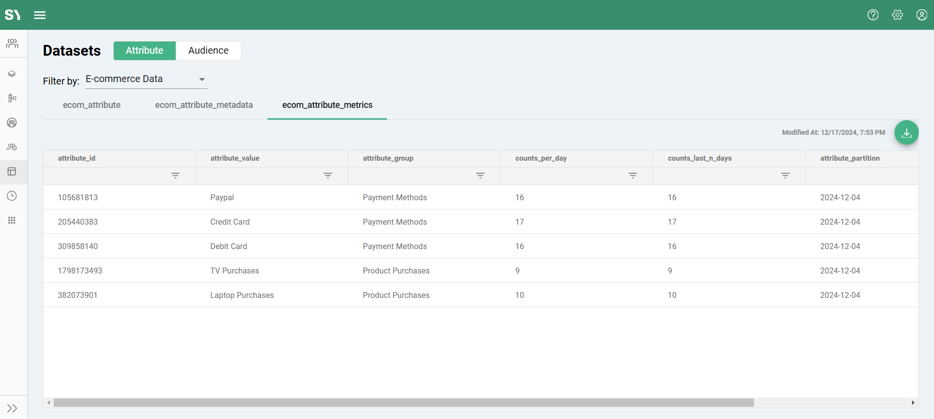 The Datasets screen shows Attribute and Audience Results Tables which serve as foundational components for managing and analyzing visitor behavior and audience segmentation within a data layer. These tables enable users to store, preview, and analyze the outcomes of attribute and audience group definitions, ensuring streamlined access to actionable insights. Each type of result table caters to specific functionality, aiding in the effective execution of audience-building processes and downstream integrations.