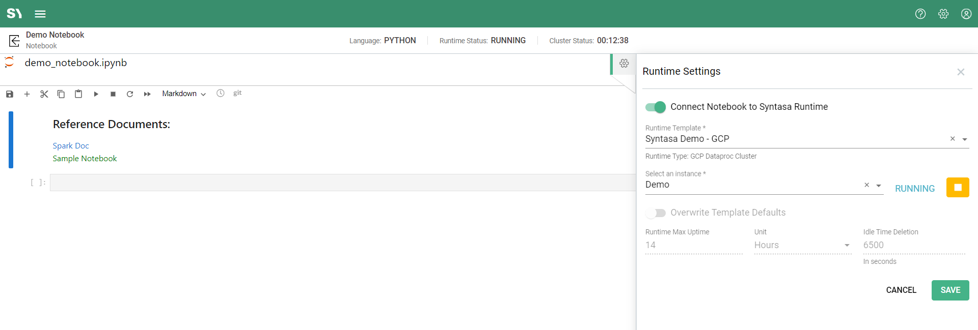 Syntasa Runtime can be enabled while creating the notebook or editing the notebook or on the JupyterHub screen. Once the runtime is enabled or saved on any screen, it will automatically reflect on the other two screens along with the runtime status i.e. Running or stopped. To check the attached Runtime details or enable the Syntasa Runtime on the JupyterHub screen, click the gear icon (