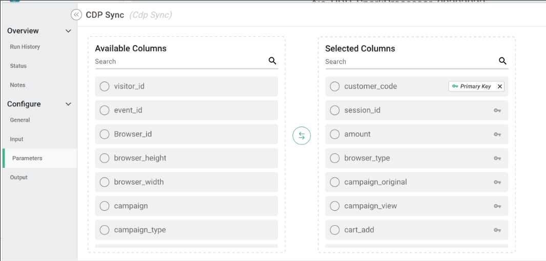 The UI is split up into two views, one being the column selector where the columns that are desired from the input table are selected and where the Primary key is associated.
