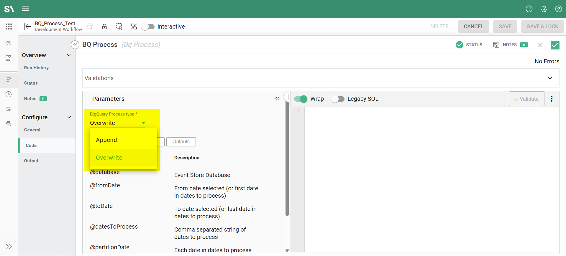 Note: The BQ Process Type dropdown shown under the Parameters section of BQ Process is applicable only for creating non-partitioned output tables. It does not apply when creating partitioned outputs.