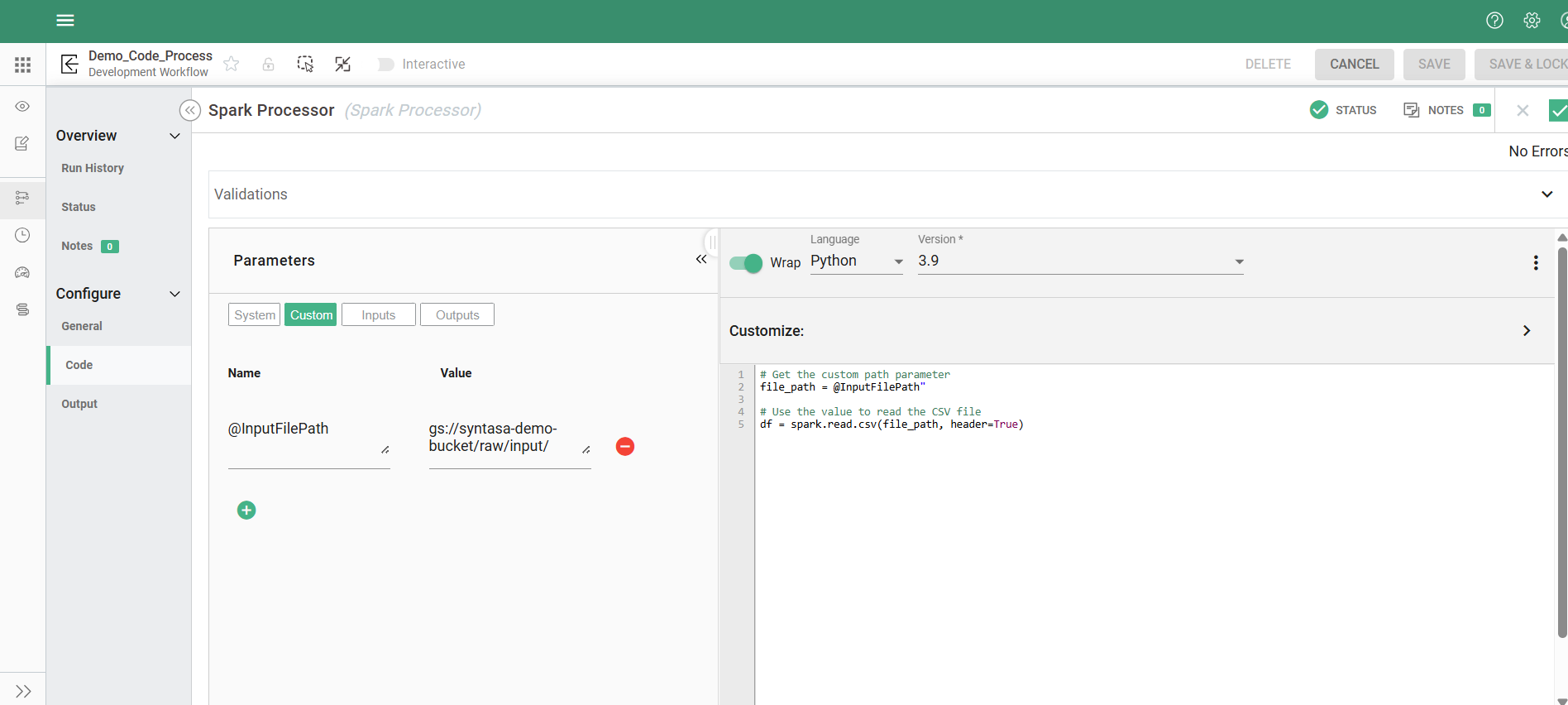 Syntasa offers various process types, including those where users can write custom code in languages like SQL, Python, Scala, or R. These "code processes" are fundamental to building custom analytics datasets and solutions. To make these code processes flexible and adaptable, Syntasa utilizes parameters. Most commonly used code processes are the Spark processor, the BQ process, and the Code Container process.