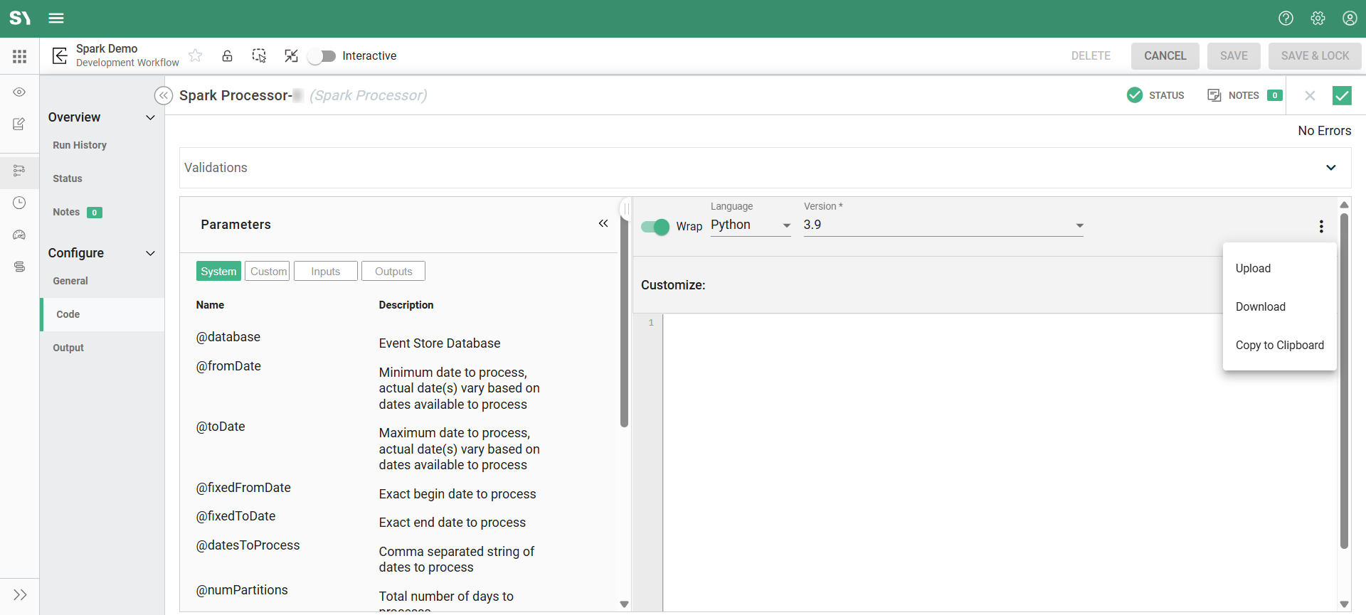 • Upload Code: Allows you to upload a code file (for example, .py, .scala, or .r file). The uploaded code replaces the existing code in the editor.