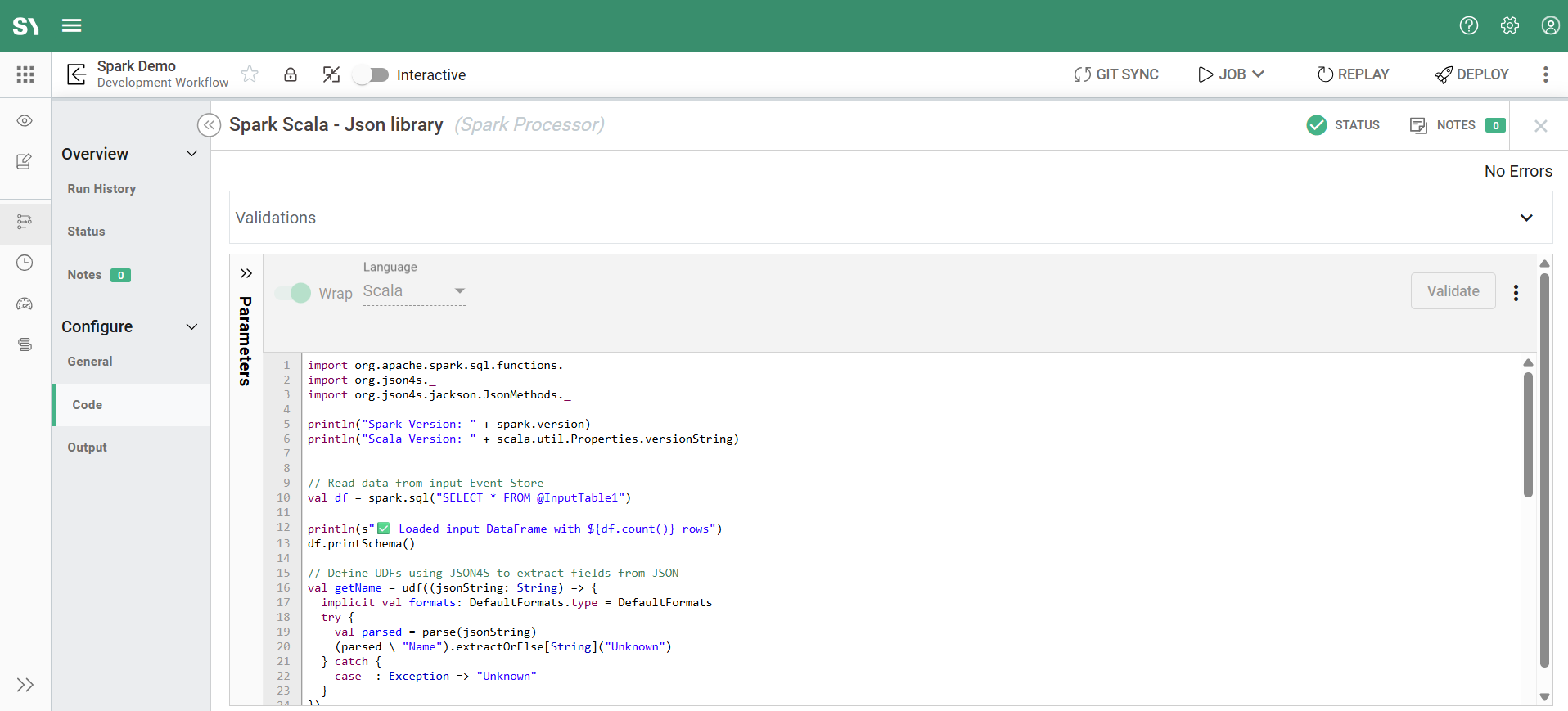 • Code Validation: Before execution, you can validate the Scala code to catch compile-time errors. This feature helps prevent job failures due to syntax or type issues.