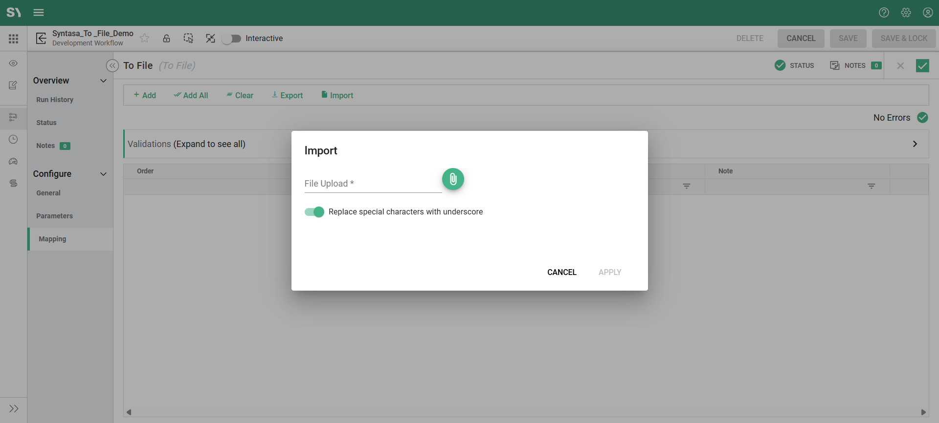 The Mapping screen in the TO FILE process allows users to control which columns are included in the output file and how they appear. This screen is essential for customizing the structure and order of your exported data. By selecting only the relevant columns, renaming them, and setting their order, users can format output files to match specific business or integration requirements.